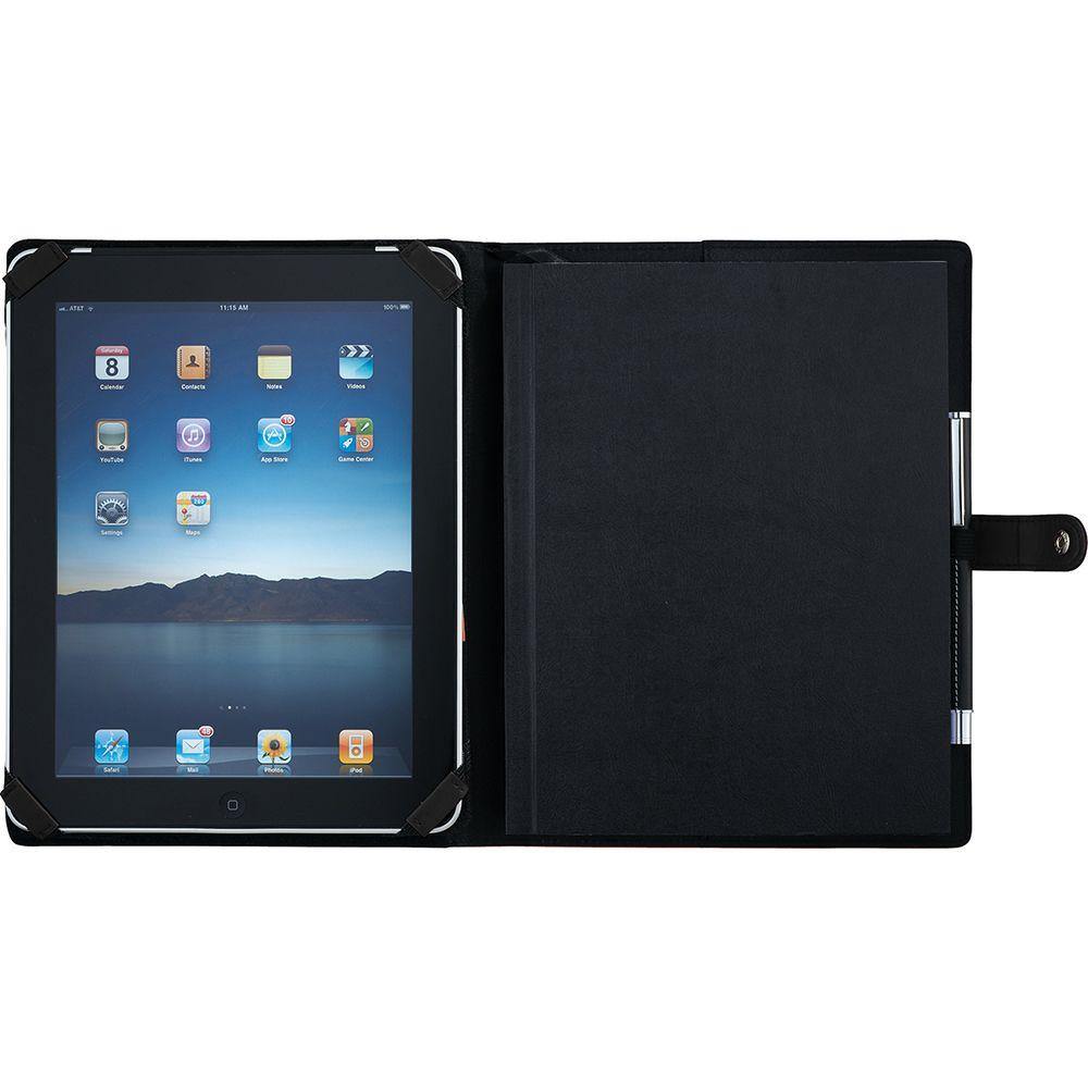 Inside cover features adjustable brackets for holding an assortment of seven inch tablets including iPad mini and most Kindle and Nook styles. Elastic pen loop. Includes 127mm x 203mm lined writing pad. Pens, iPad and devices not included. Branding Options Colour Print Deboss Debossed Foil Foil Stamp Full Colour Print ...