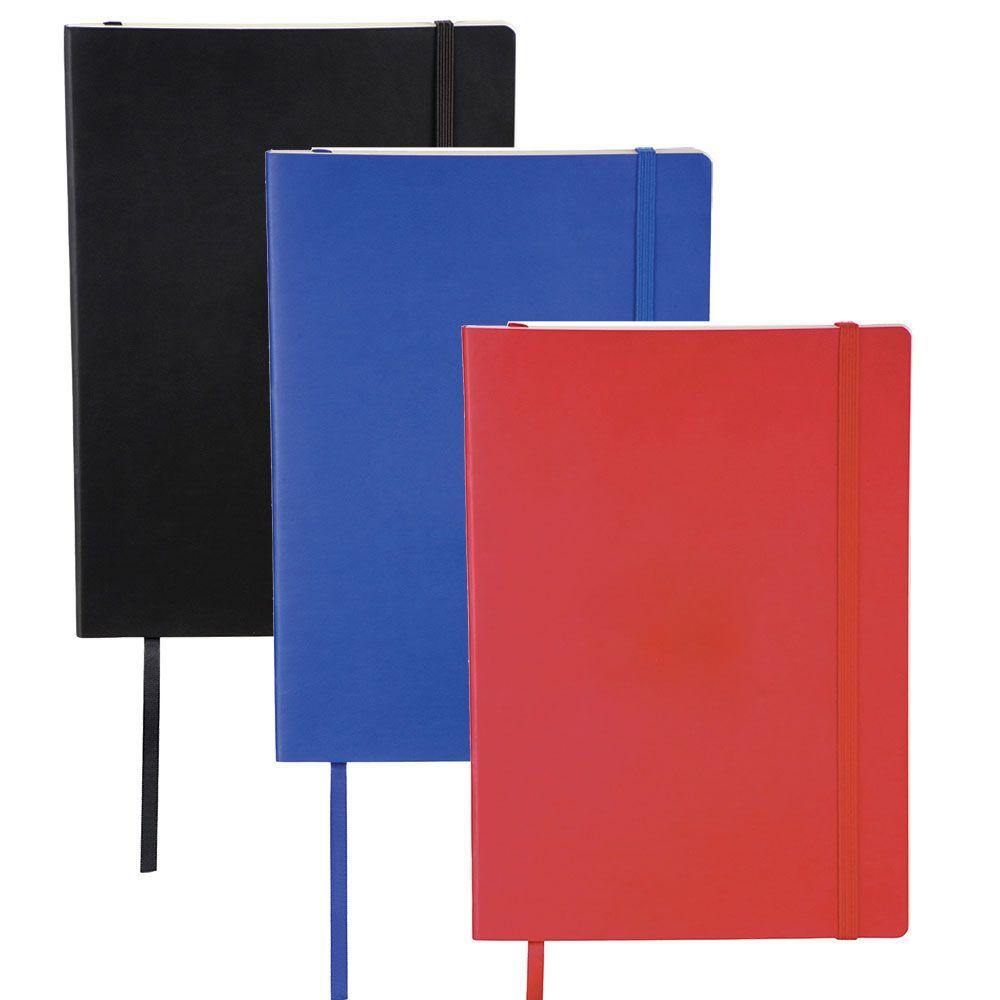 Flexible, soft cover with built in elastic closure. Available in 3 colours. Branding Options Colour Print Deboss Debossed Foil Foil Stamp Full Colour Print Print/Screen: 150mm(h) x 85mm(w) Dimensions 241mm(h) x 171mm(w) x 19mm(d) Packaging Polybag