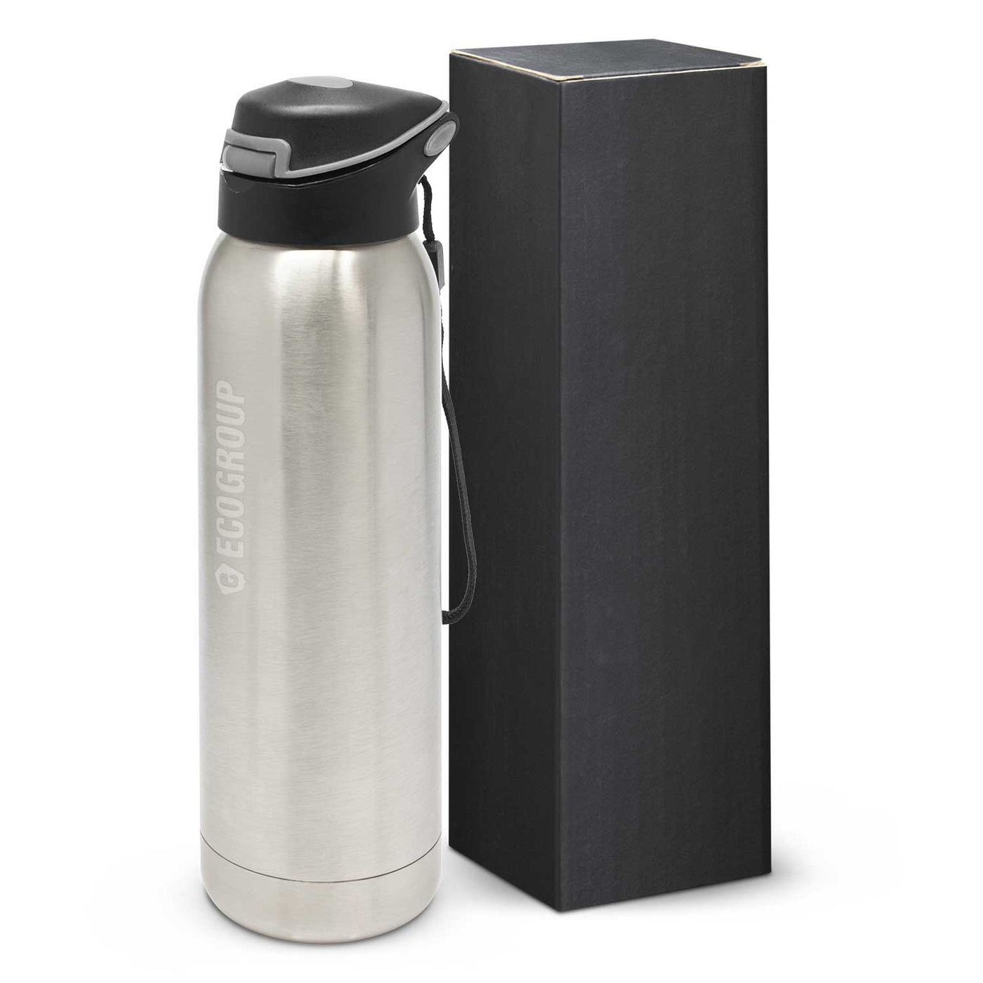 900ml single wall drink bottle is made from stainless steel and comes with a secure screw on lid featuring a silicone band for extra grip. This water bottle comes in a sleek matte black or a white high gloss paint finish, along with a convenient carry handle. this bottle is the perfect blend of style and practicality, and is presented in a natur...