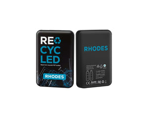 Manufactured from 2 Recycled PET bottles, the Rhodes Eco powerbank delivers power beyond its size and easily fits into your pocket! The Rhodes provides a 5000 mAh, A-Grade Lithium-Polymer battery packed into a slim and lightweight RPET case and features Type-C and Micro USB inputs, Type-C and dual USB-A outputs, LED capacity indicator and protec...