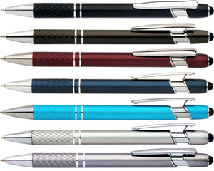 Retractable aluminium stylish design pen with a shiny silver chrome trim soft rubberised barrel in a range of colours and a stylus black top for touch screens. Click action with plastic Cross-Type German manufactured black ink refill 1200 meters writing distance tungsten carbide ball provides you with quality writing.