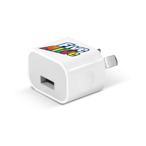 USB mains adaptor plug for charging electronic devices from mains power sockets. It is SAA and RCM approved for use in New Zealand and Australia. Branding Options Pad Print Pad Print Direct Digital Direct Digital Pad Print Top - 24mm x 20mm.|Pad Print Above USB port - 26mm x 8mm.|Direct Digital Top - 24mm x 20mm.|Direct D...