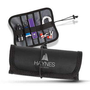 Roll up electronic organiser with an elastic cord closure. It is manufactured from a combination of 600D and 210D polyester and has internal elastic straps to hold accessories in place. A production lead time of 10-15 working days applies to this product. Branding Options Screen Print Screen Print Digital Transfer Digital Tran...