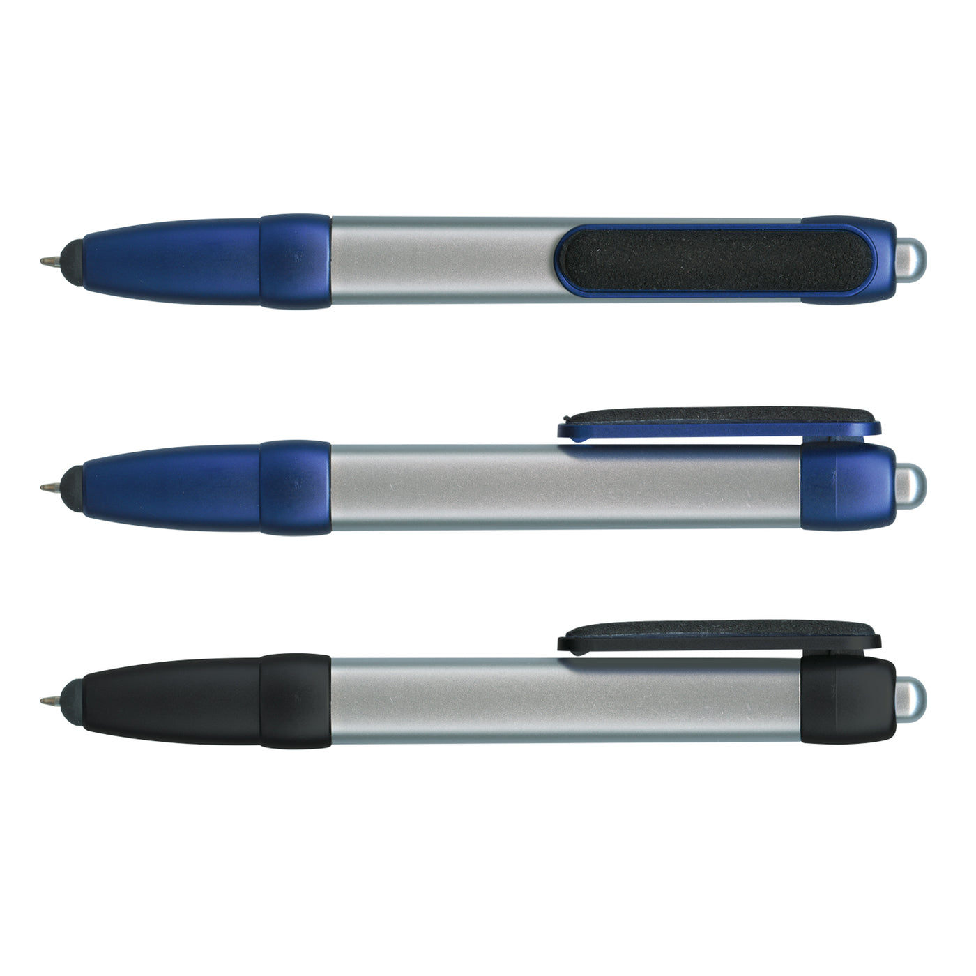 Click action 3 in 1 aluminium stylus mobile phone stand metal pen brushed metallic barrel with 5 stylish shiny silver chrome rings a stylus for touch screen and black plastic clip and tip broad printing area on clip plastic Parker-Type German manufactured black ink refill 1200 meters writing distance tungsten carbide ball provides you with quali...